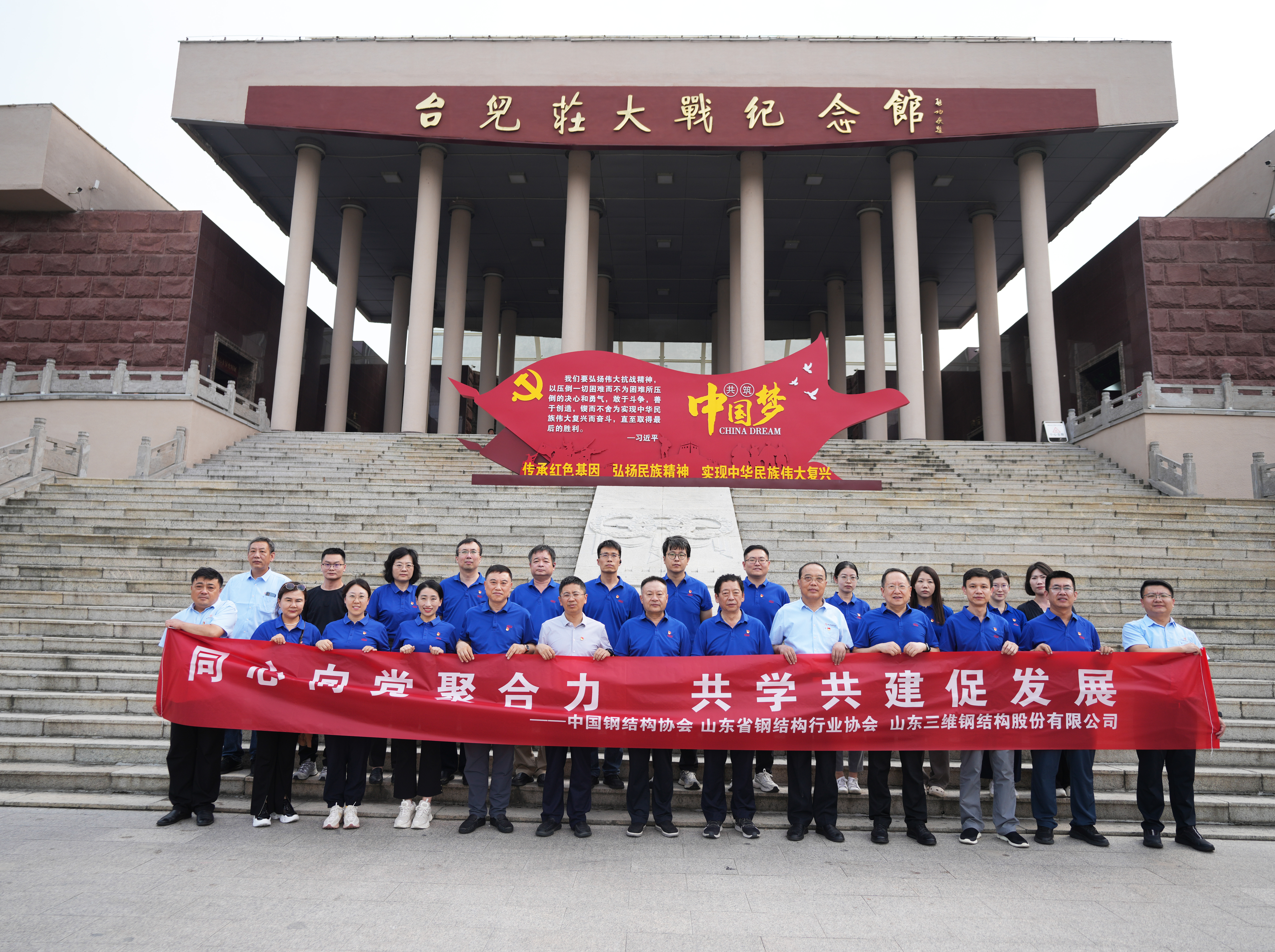 在紀(jì)念中國(guó)人民抗日戰(zhàn)爭(zhēng)暨世界反法西斯戰(zhàn)爭(zhēng)勝利80周年的重要?dú)v史時(shí)刻,為深入學(xué)習(xí)貫徹黨的二十大精神,充分發(fā)揮協(xié)會(huì)黨建引領(lǐng)作用,加強(qiáng)黨員隊(duì)伍建設(shè),提升黨組織號(hào)召力、凝聚力和戰(zhàn)斗力,中國(guó)鋼結(jié)構(gòu)協(xié)會(huì)、山東省鋼結(jié)構(gòu)行業(yè)協(xié)會(huì)與山東三維鋼構(gòu)股份有限公司于2025年8月29日至30日共同開(kāi)展黨建聯(lián)建活動(dòng)。本次活動(dòng)以“黨建引領(lǐng)聚合力,攜手共建促發(fā)展”為主題,通過(guò)企業(yè)黨建交流與紅色教育基地參觀學(xué)習(xí)相結(jié)合的方式,進(jìn)一步增強(qiáng)黨性修養(yǎng),凝聚行業(yè)力量。
