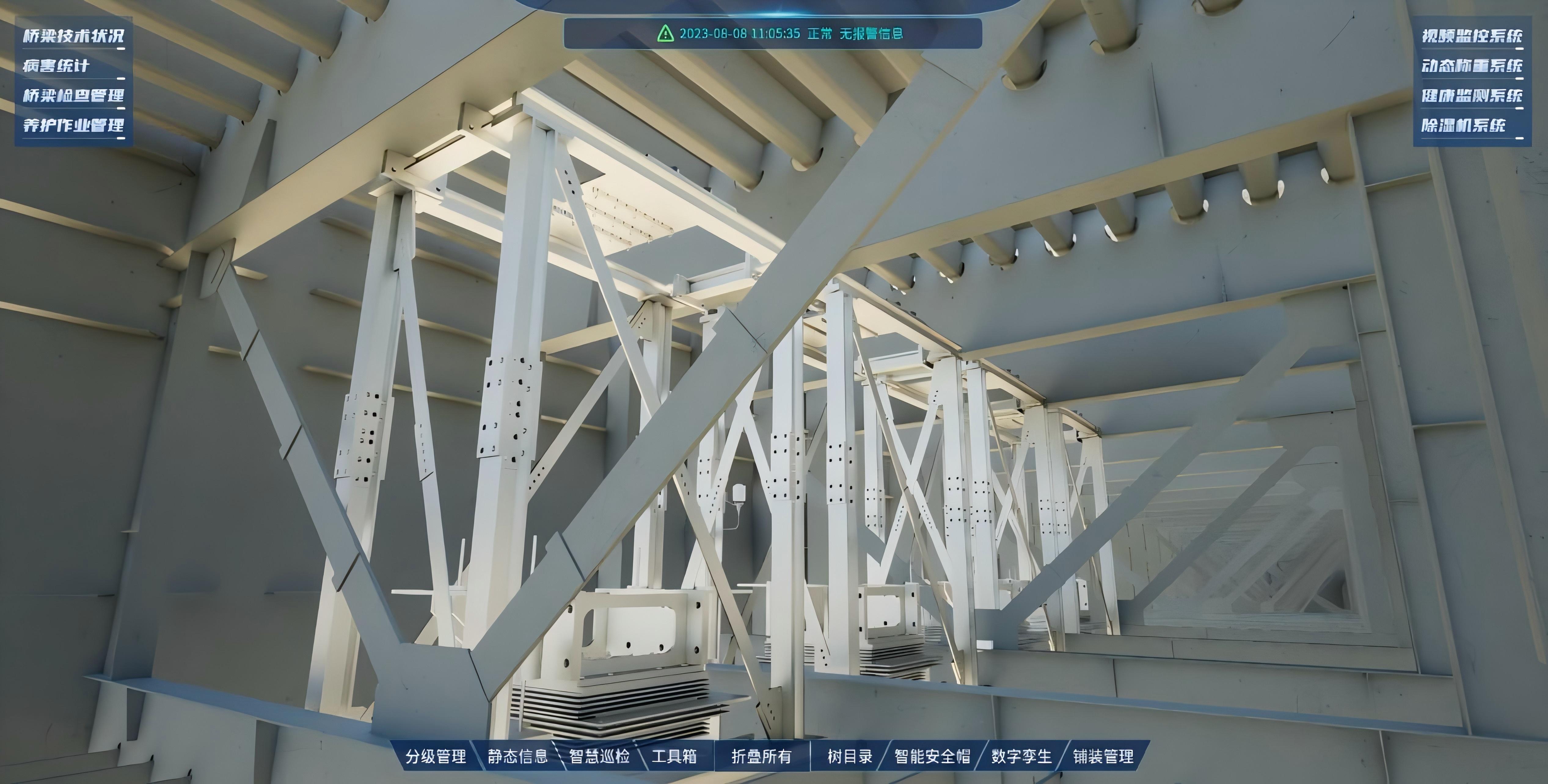 圍繞荷載時變響應(yīng)難捕捉、性能退化量化滯后等診斷難點(diǎn),構(gòu)建了多源數(shù)據(jù)與物理模型相融合的鋼橋安全性、適用性及功能性綜合評價體系,攻克了服役性態(tài)實(shí)時診斷的技術(shù)瓶頸。開發(fā)了智慧運(yùn)維數(shù)字孿生平臺,集成結(jié)構(gòu)孿生、無人機(jī)巡檢與決策分析等23個功能模塊,基本實(shí)現(xiàn)了“檢查-評估-維修”全流程閉環(huán)管理,推動橋梁管養(yǎng)從“被動處置”向“數(shù)據(jù)智能驅(qū)動”的新范式轉(zhuǎn)變。通過智能巡檢裝備、數(shù)據(jù)—物理協(xié)同診斷模型與數(shù)字孿生平臺的系統(tǒng)集成,項(xiàng)目形成了數(shù)字賦能的大跨鋼橋服役性態(tài)實(shí)時診斷與智能管養(yǎng)關(guān)鍵技術(shù)體系,實(shí)現(xiàn)了隱蔽病害精準(zhǔn)識別、服役狀態(tài)快速預(yù)警與檢-評-修一體化管控,顯著提升了結(jié)構(gòu)安全性與耐久性,降低了突發(fā)事故風(fēng)險。
