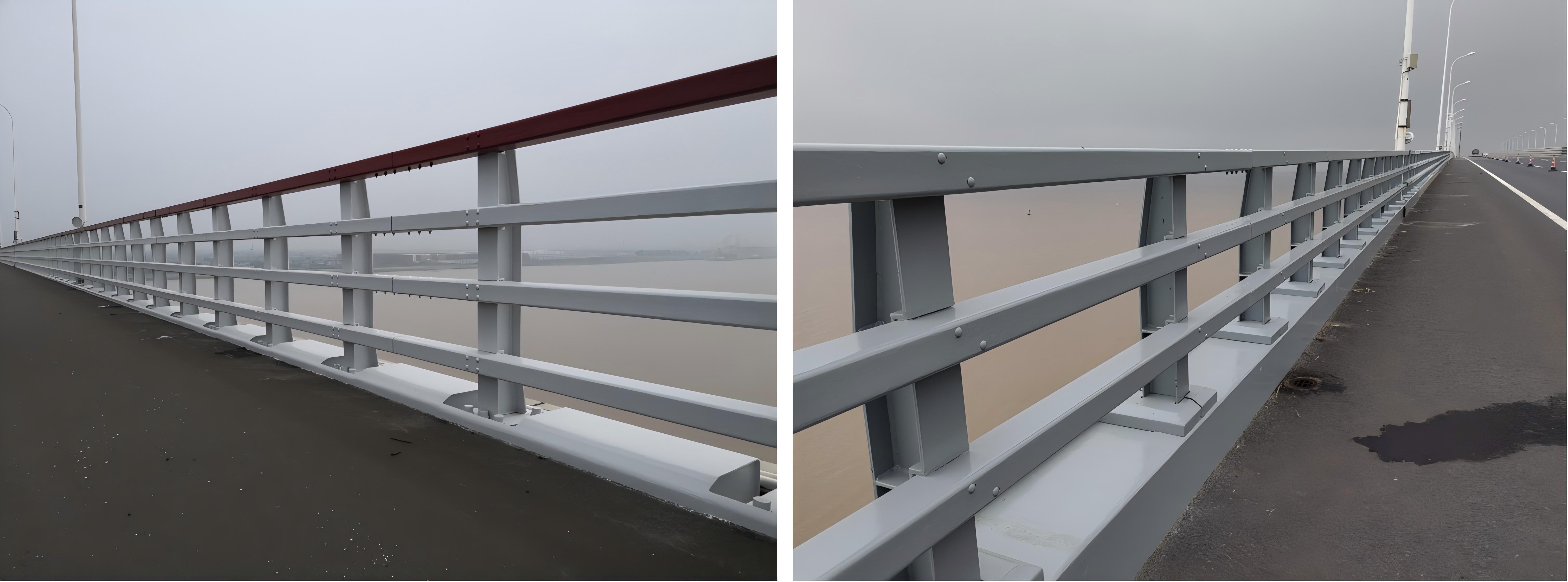 圖4 制備關(guān)鍵尺寸0.85nm~50nm的納米材料,經(jīng)共價鍵功能化形成含3000疊層的超致密涂層(150μm),成功應(yīng)用于崇啟大橋防護(hù)欄翻新維修