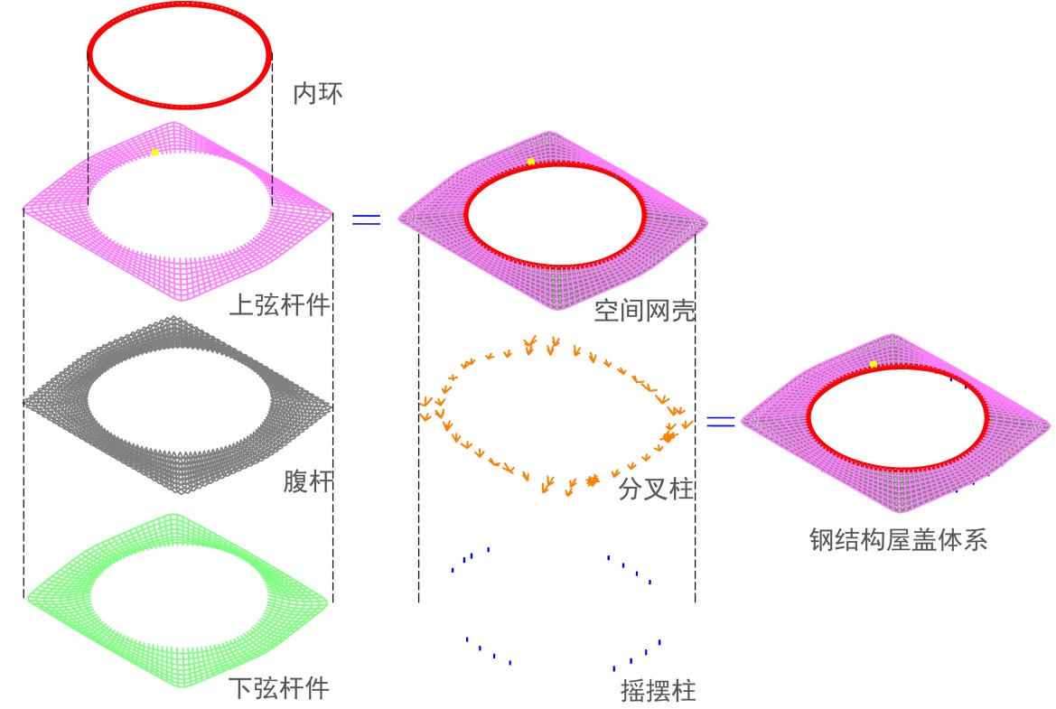 在受力清晰、化繁為簡的結構體系中創新采用搖擺柱+分叉柱支撐體系,實現了屋蓋結構豎向力和水平力的合理傳遞。