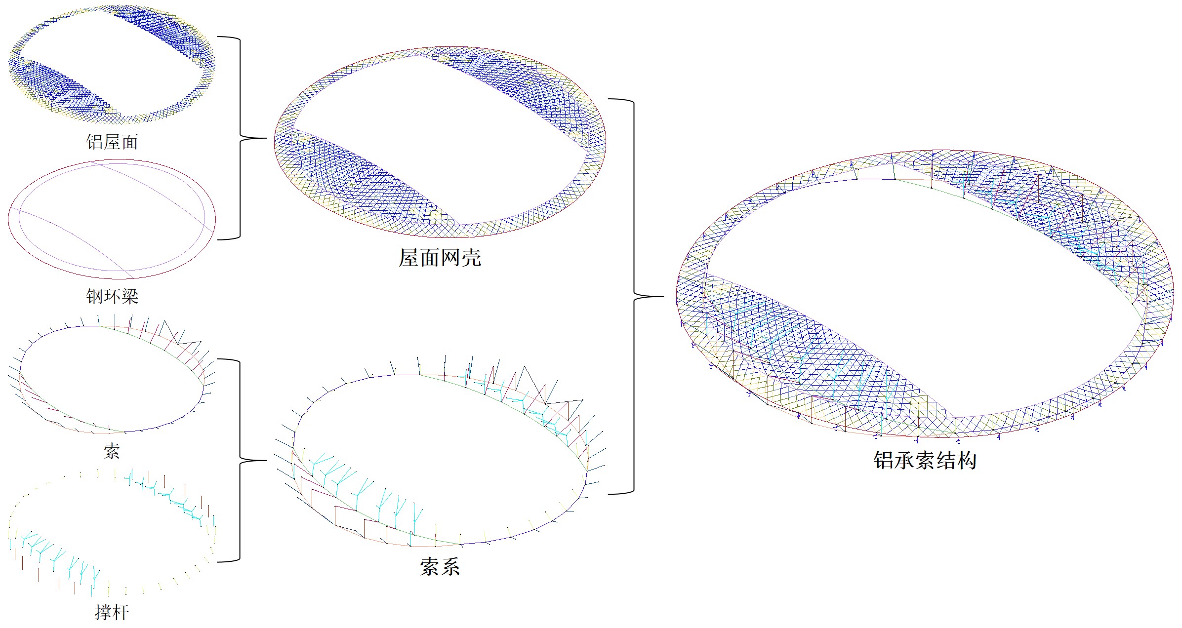 對于兩向跨度相差較大且中間開洞近似矩形的建筑造型,傳統索承結構會導致受力不均、索力難控等問題,對此創新性提出一種自平衡水平分索弦支大開口網格結構體系。