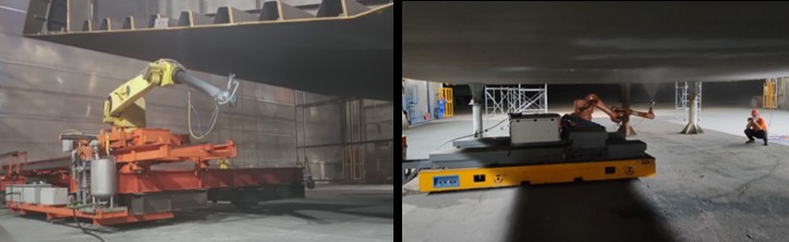(3)開展主索鞍鞍體主縱肋與鞍頭底面磨光頂緊預(yù)研試驗(yàn),研發(fā)精度控制技術(shù),主筋板與鞍頭金屬接觸率最高達(dá)99.56%,遠(yuǎn)超設(shè)計(jì)要求;研發(fā)了鋼箱梁智能焊接裝備,實(shí)現(xiàn)了鋼箱梁95%智能焊接;研發(fā)了鋼箱梁智能涂裝技術(shù)及裝備;自主研發(fā)專用自適應(yīng)浮動(dòng)打磨裝置及打磨程序系統(tǒng),形成“機(jī)器人 + 專用工裝 + 智能系統(tǒng)”的全自主化智能打磨機(jī)器系統(tǒng)。
