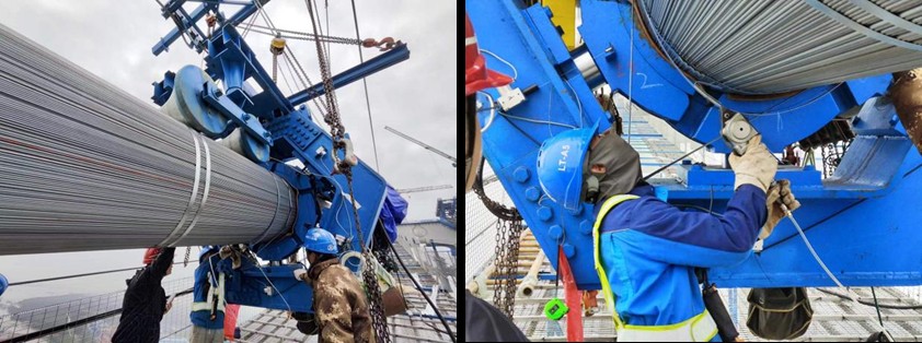 (4)國(guó)內(nèi)首創(chuàng)小循環(huán)索股智能循環(huán)牽引系統(tǒng),研發(fā)智能控制系統(tǒng)平臺(tái);研發(fā)超大直徑主纜智能緊纜控制系統(tǒng)和裝備,實(shí)現(xiàn)主纜牽引過(guò)程實(shí)時(shí)監(jiān)控、自動(dòng)化控制;研發(fā)1500米級(jí)懸索橋智能控制系統(tǒng)平臺(tái),實(shí)現(xiàn)跨纜吊機(jī)安全監(jiān)控和實(shí)時(shí)預(yù)警以及吊裝過(guò)程中梁段姿態(tài)實(shí)時(shí)監(jiān)控和自動(dòng)糾偏。