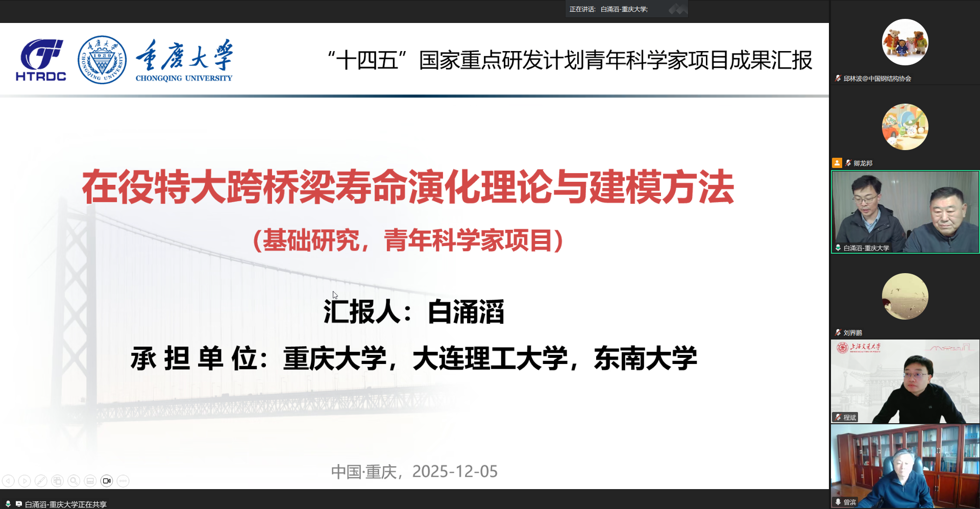 2025年12月5日,中國鋼結構協會組織召開了“十四五”國家重點研發計劃“交通基礎設施”重點專項青年科學家項目“在役特大跨橋梁壽命演化理論與建模方法”科技成果評價會。該成果由重慶大學牽頭負責,大連理工大學與東南大學等單位共同完成。