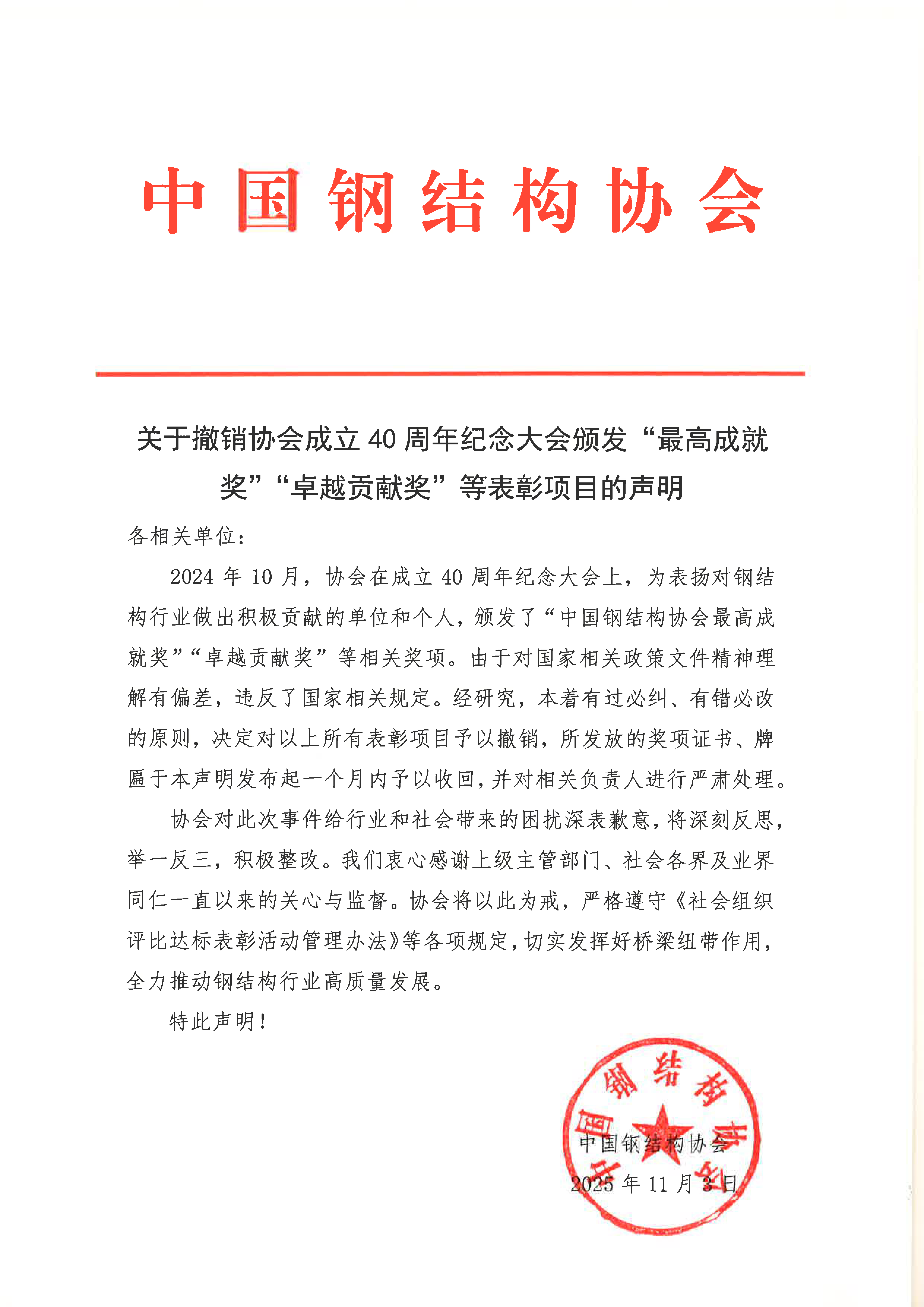 關于撤銷協(xié)會成立40周年紀念大會頒發(fā)“最高成就獎”“卓越貢獻獎”等表彰項目的聲明